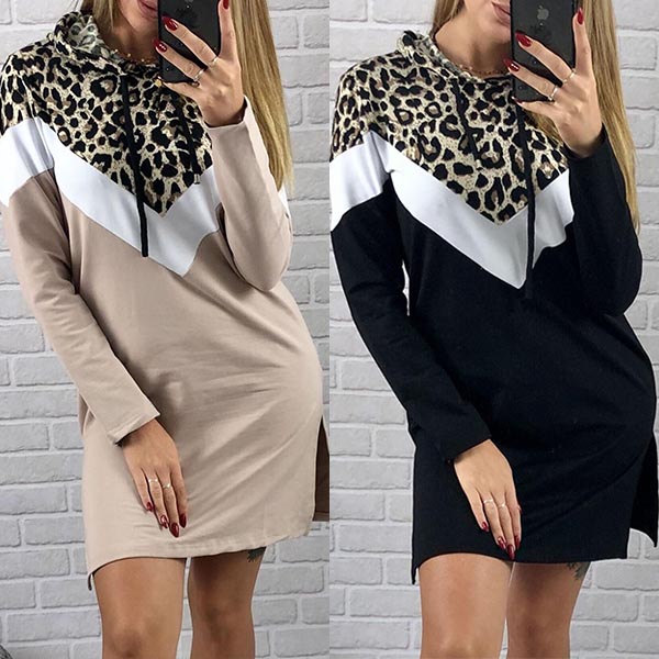Fashion Leopard Spliced Long Sleeve Hooded Sweatshirt Dress