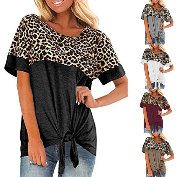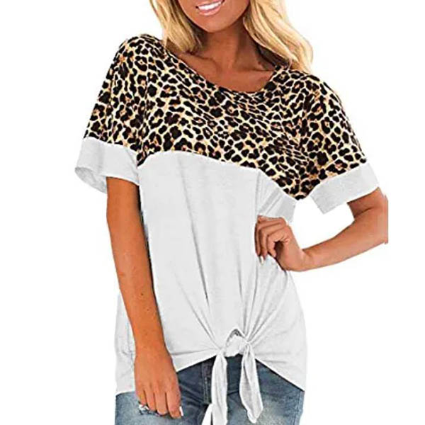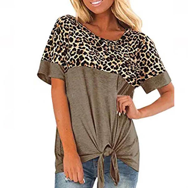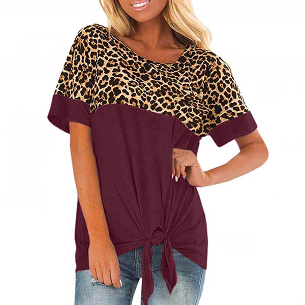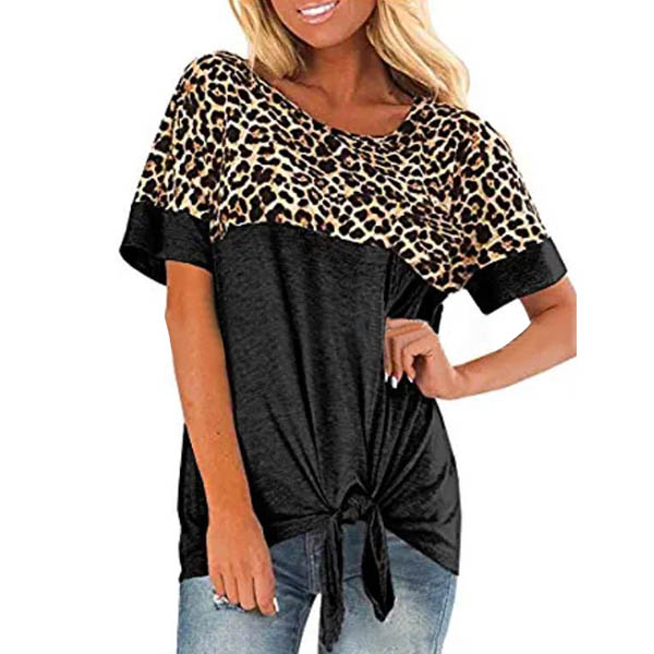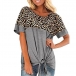 Fashion Leopard Spliced Short Sleeve Knotted Hem T-shirt
