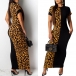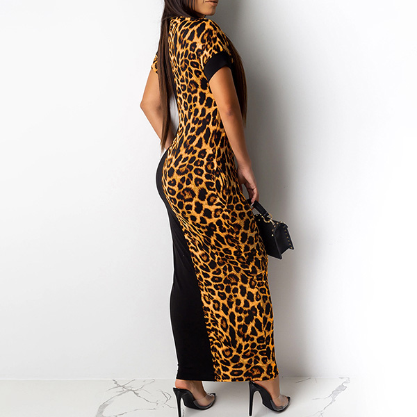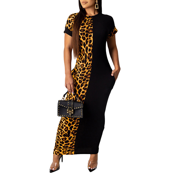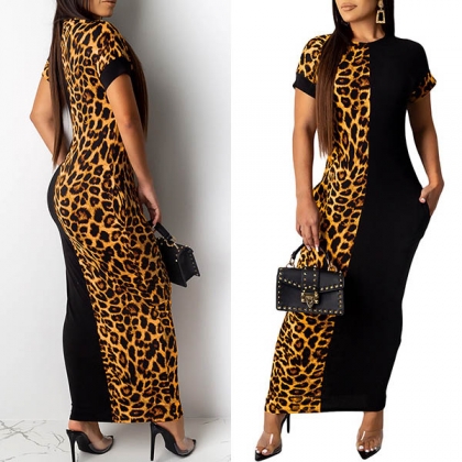 Fashion Leopard Spliced Short Sleeve Round Neck Dress