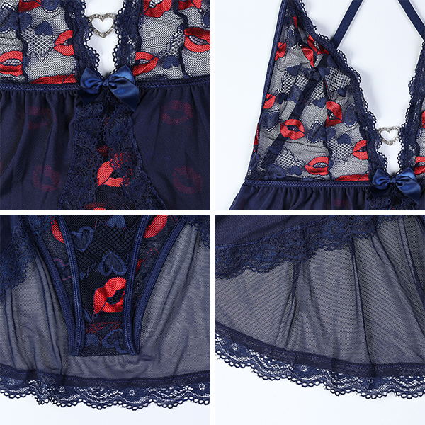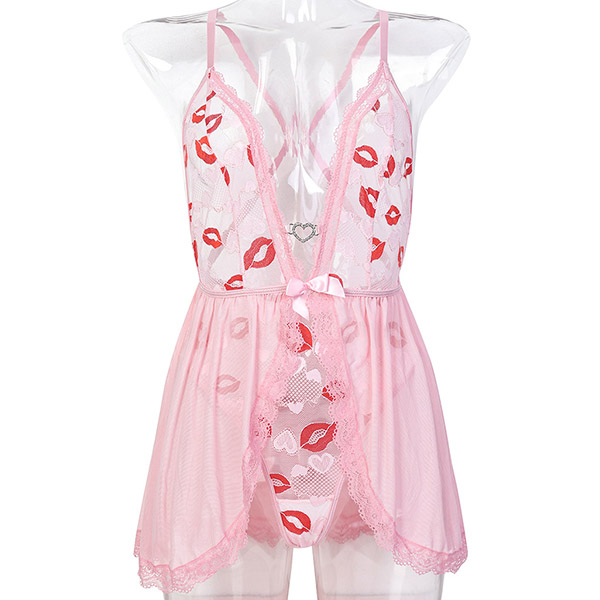 Tvådelat Underklädesset med Modern Läpptryck, V-ringning, Spets och Framslits i Gaze