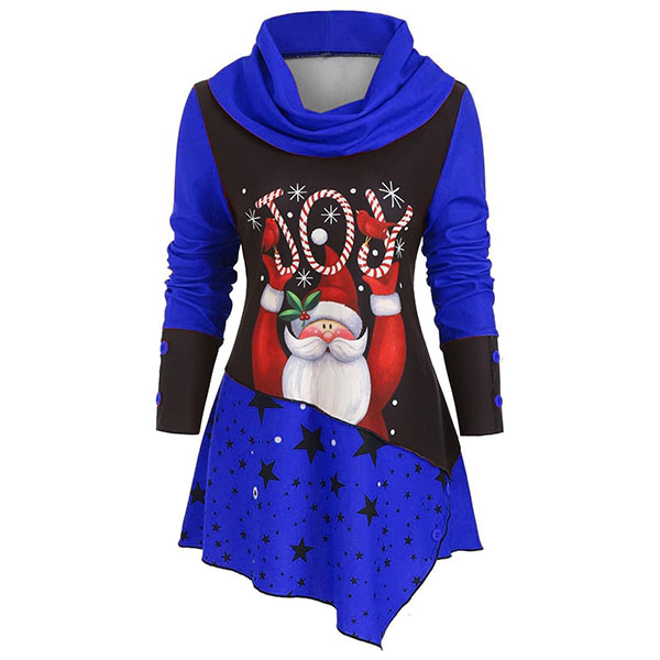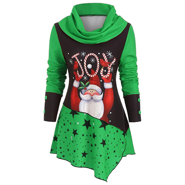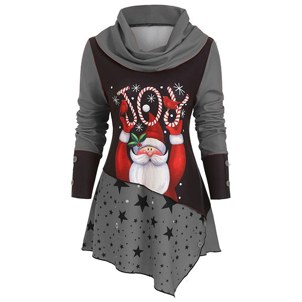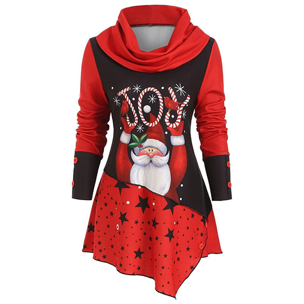 If you have no idea about what to wear for the coming Christmas Day,then you can make your eyes focused on top.The Santa Claus printed pattern design makes it look so cute and playful,while the cowl neck and irregular hem design will make it look more attractive. Wear it to the Christmas party,you can arouse more eyes.