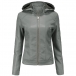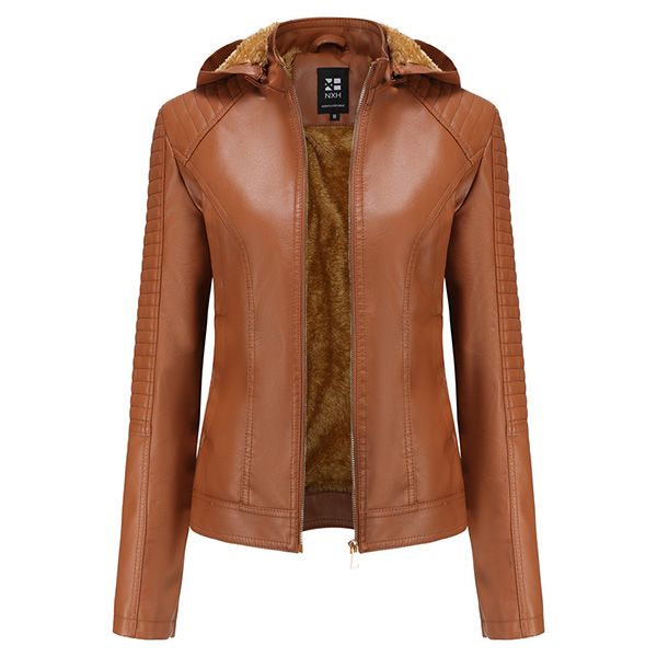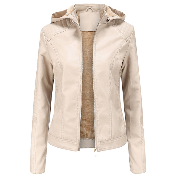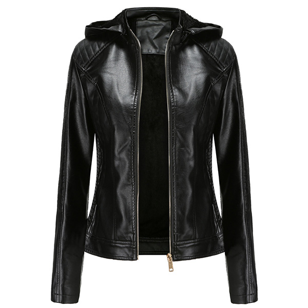 Långärmad PU-läderjacka med avtagbar huva och plyschfoder