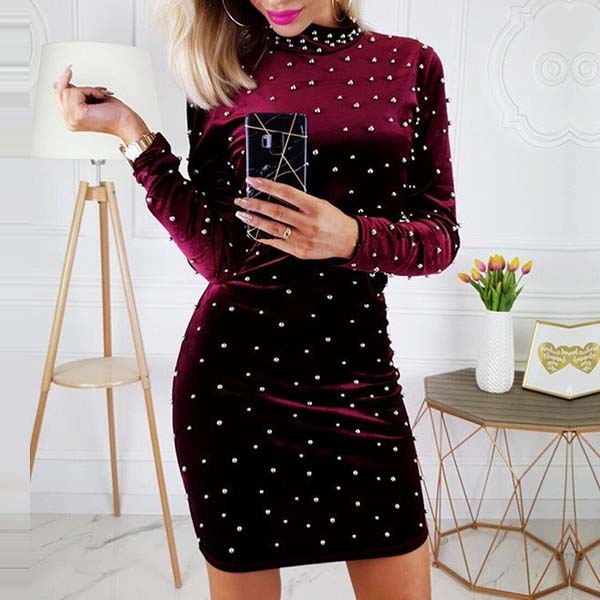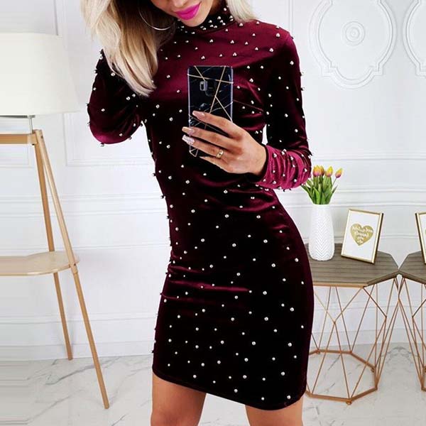 You can easily win more eyes when you wear this stunning dress. It is finished with long sleeve,mock neck and a fit silhouette,this dress can showcase your slender figure. Moreover,the beaded details will make this piece look more attractive. For your dinner dates and weekend gatherings,this little stunner can be a good choice.