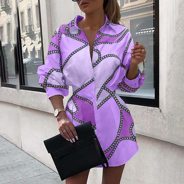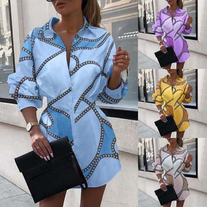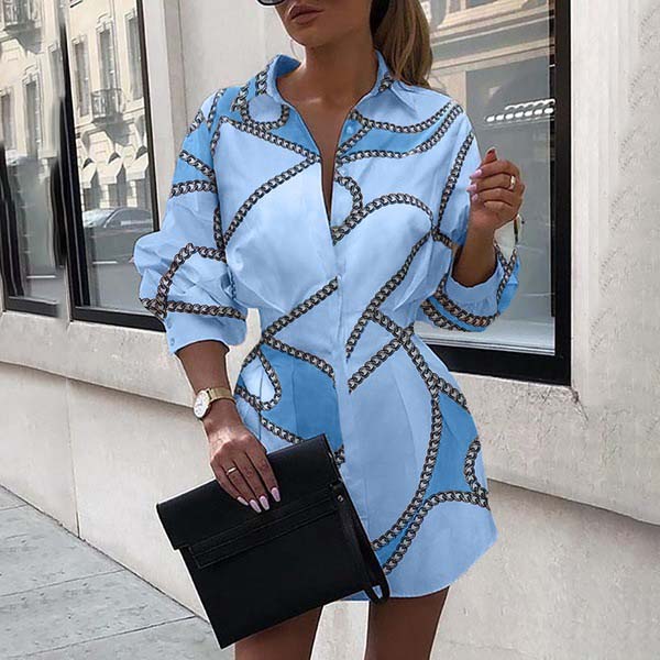 This shirt dress that is fit for your busy workdays and weekend out is worth to have a place in your wardrobe. It is finished with long sleeve and POLO collar design,the chain printed details make this piece look so chic and eye-catching. Simply need to match with your favourite shoes,then you can achieve for a stylish and charming daily look.