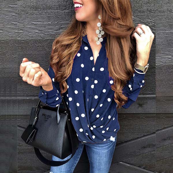 When in doubt,then make your eyes focused on this wonderful piece,you could hardly go wrong with this stylish shirt! The dots printed details make it look more playful and eye-catching,while the unique hem design will further enhance its charm. Just need to match with your favourite jeans,then you can look fashionable enough!