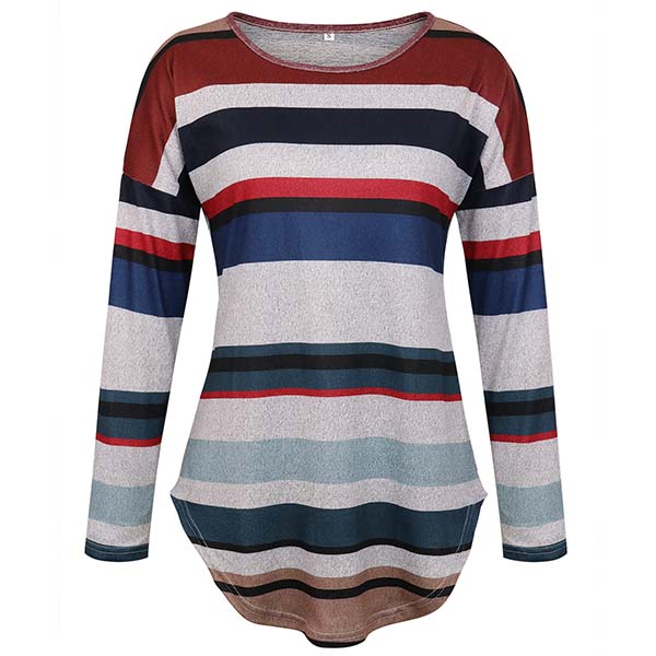 Stripe element is always the darling in the fashion trend. So why not catch up with this trend with this striped t-shirt? The colorful striped printed and arc hem design make this piece look more eye-catching and stylish,while its soft and breathable fabric will ensure you a comfortable day. Enjoy a cozy yet stylish style in this t-shirt.