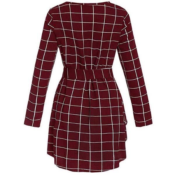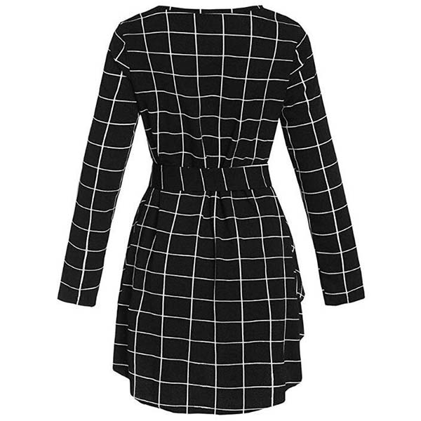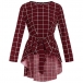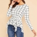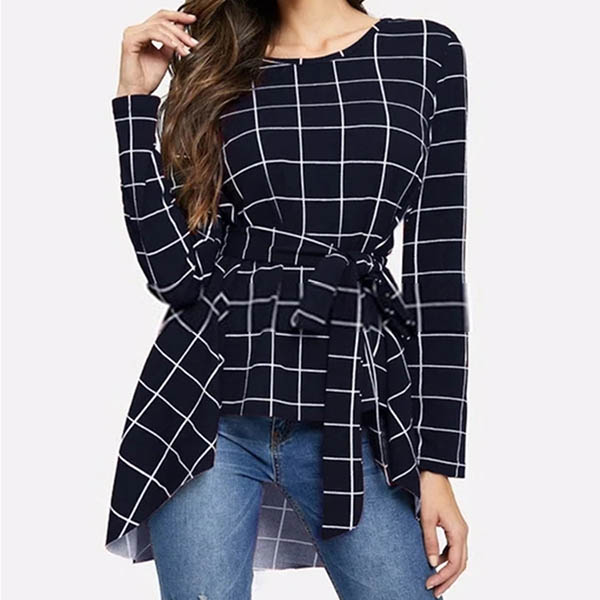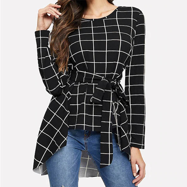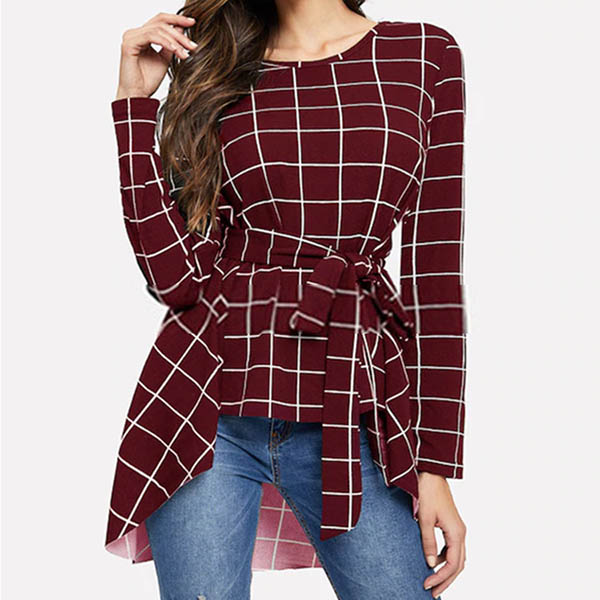 Fashion Long Sleeve Round Neck High-low Hem Lace-up Plaid Top