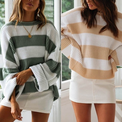It is a good chance to give your wardrobe a seasonal update with this knit top! Designed with striped element,outfitted with long sleeve,round neck and a loose silhouette,this piece knows how to give you a warm days as well as offer you a stylish style.