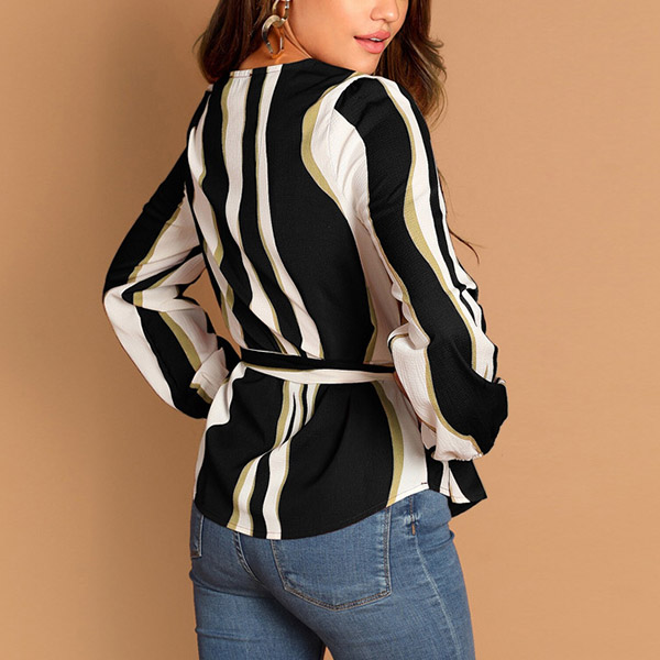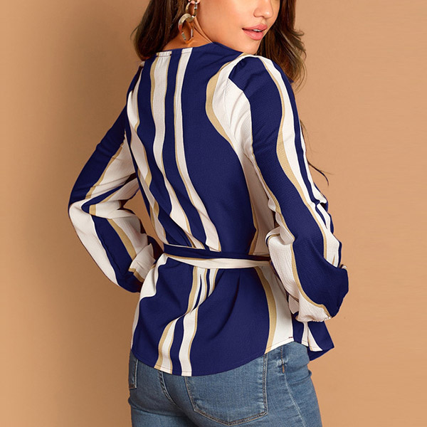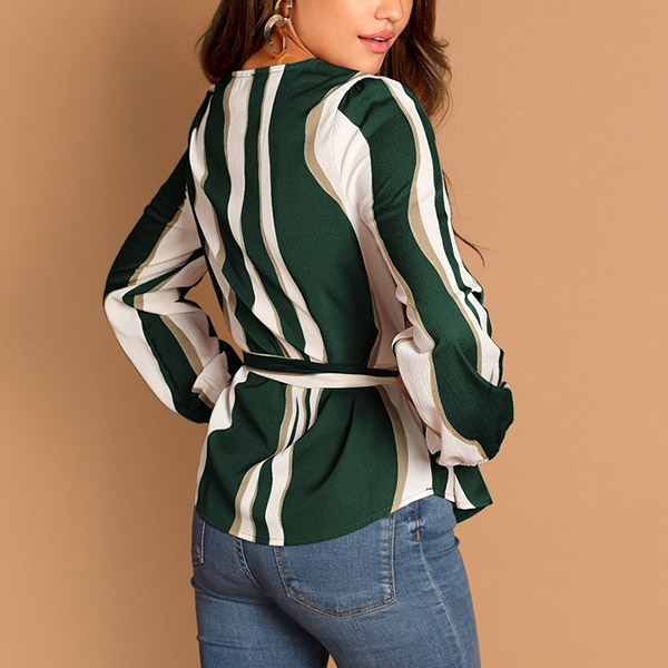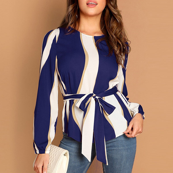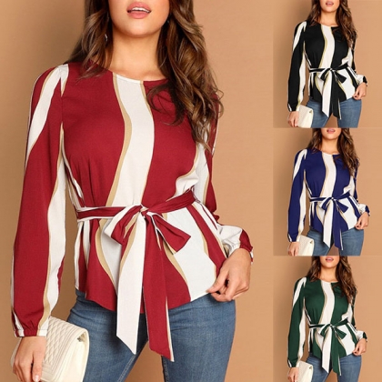 Fashion Long Sleeve Round Neck Striped Blouse with Waist Strap