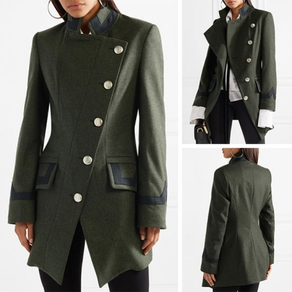 Fashion Long Sleeve Stand Collar Oblique Button Coat