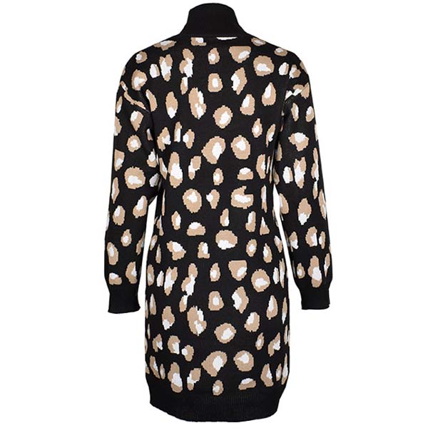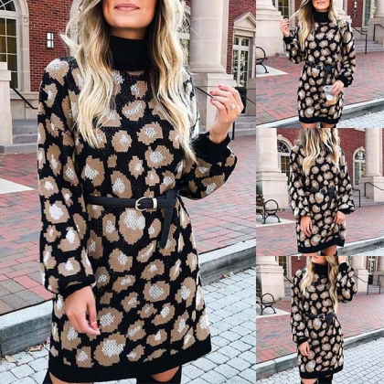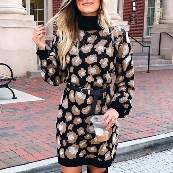 Fashion Long Sleeve Turtleneck Leopard Printed Sweater Dress