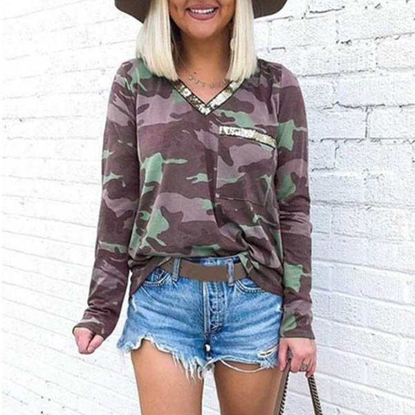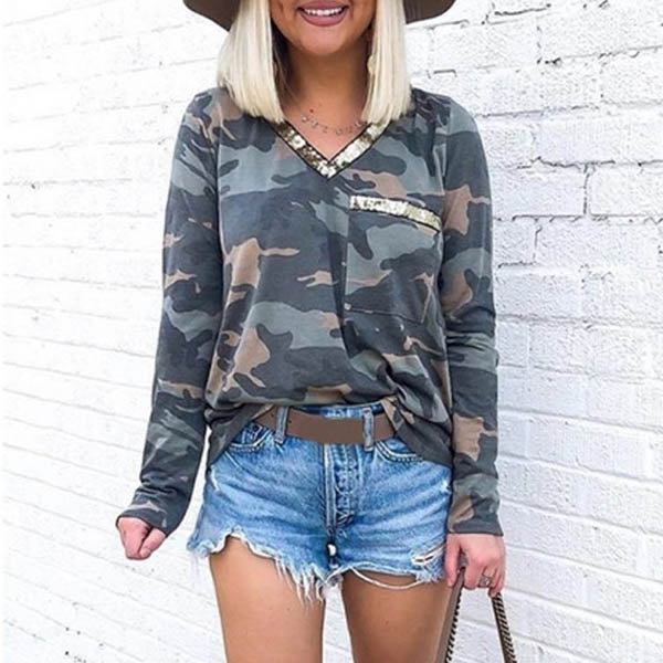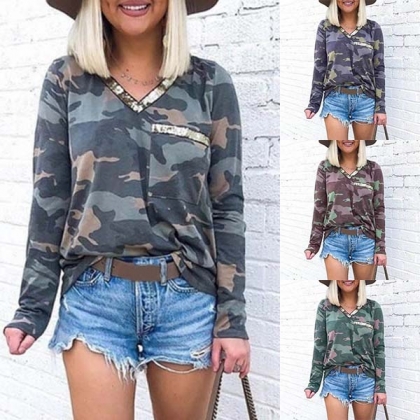 Fashion Long Sleeve V-neck Camouflage Printed T-shirt