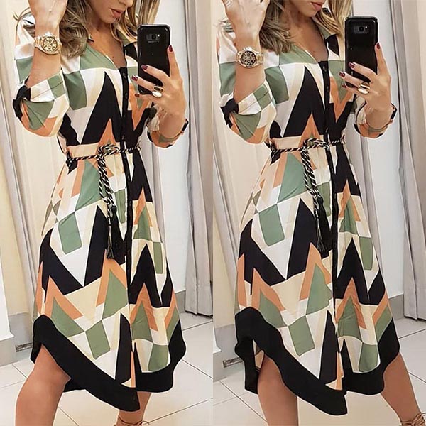 Style and sophistication come together so perfectly in this shirt dress! Contrast color printed details will make this piece look more eye-catching. Comes with a thin waist chain,which can help highlight your figure. No matter for your busy workdays or weekend out,this versatile dress can be a wise choice.