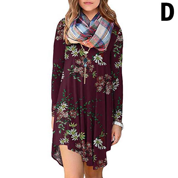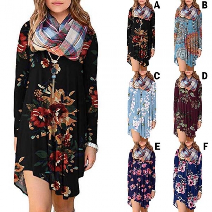 Fashion Long Sleeve V-neck Irregular Hem Loose Printed Dress