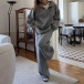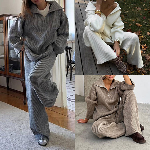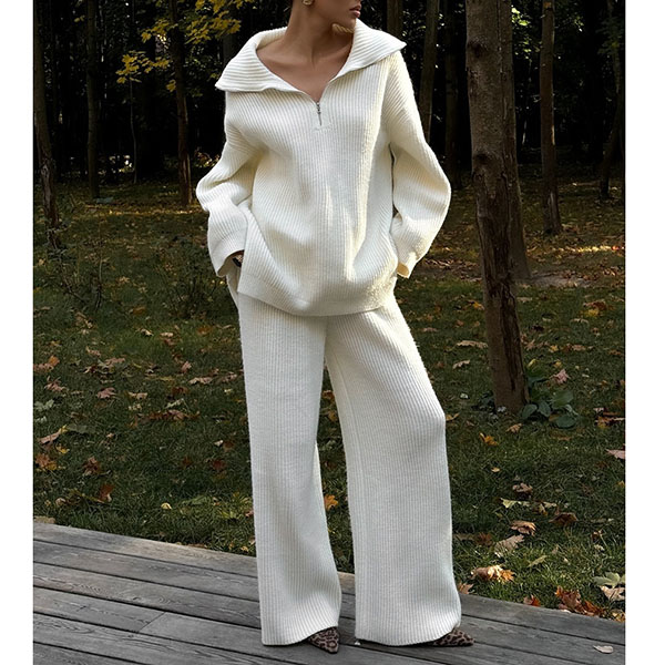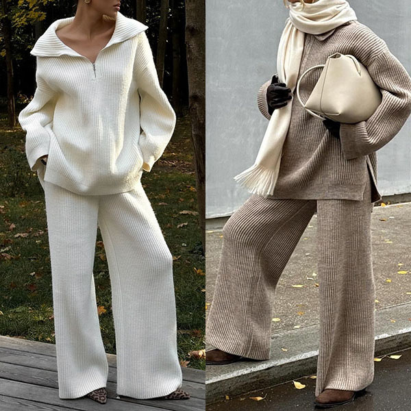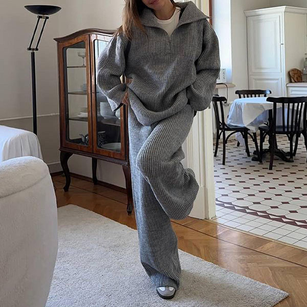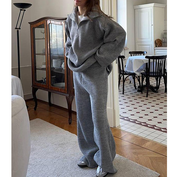 Tvådelat oversize stickat set med halvdragkedjetröja och vida byxor
