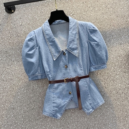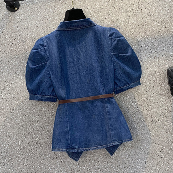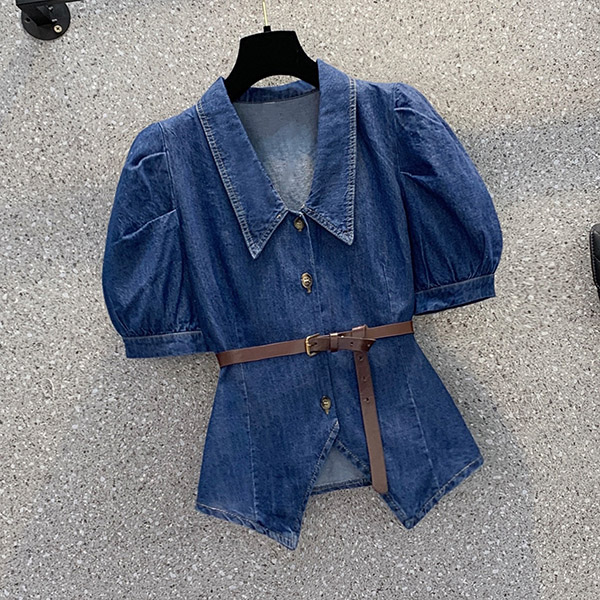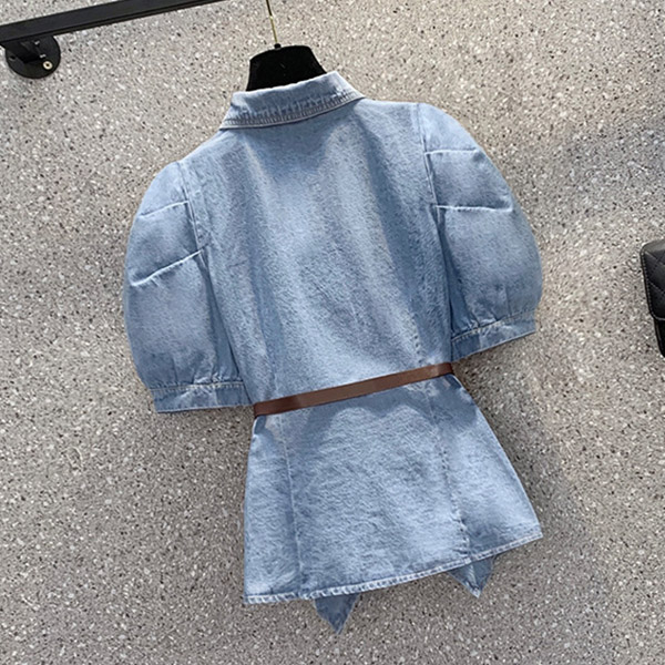 Your style can have an instant boost when you wear this denim shirt. It is finished with lotus sleeve,POLO collar and short-style design,sweet yet stylish. The waist strap design will further enhance its charm. I promise only need one glance,you would be attracted by this wonderful top.