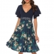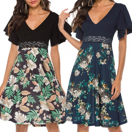 Fashion Lotus Sleeve V-neck High Waist Printed Dress