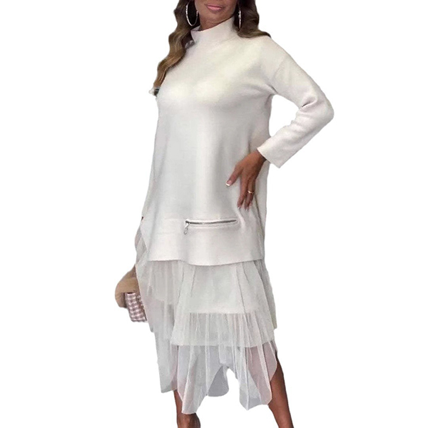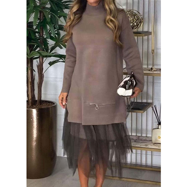 Trendig midiklänning med hög krage, långa ärmar, sidodragkedja och panelerad fåll
