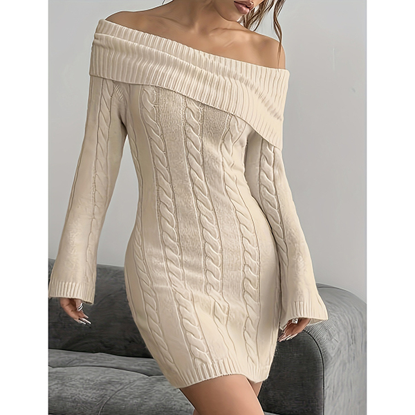 Romantisk off-shoulder-tröjklänning i mjukt, kabelstickat material som förenar feminin elegans med mysig höstvärme. Den breda off-shoulder-ringningen ramar in axlarna och skapar en graciös siluett, medan det klassiska kabelstickade mönstret tillför tidlös hantverkscharm. Stickad i en exklusiv ullblandning som håller dig varm utan att bli klumpig, är den perfekt för dejtkvällar, romantiska sociala tillställningar eller stilfulla höstpromenader. Figursydd längd som framhäver kurvorna och enkel att kombinera med både stövlar och sneakers för en mångsidig, trendig look. En unik tröjklänning som skiljer sig från mängden – ge din garderob en mysig och elegant uppgradering.