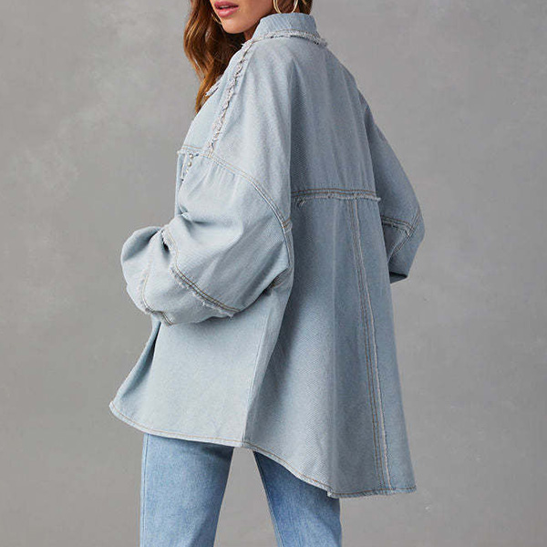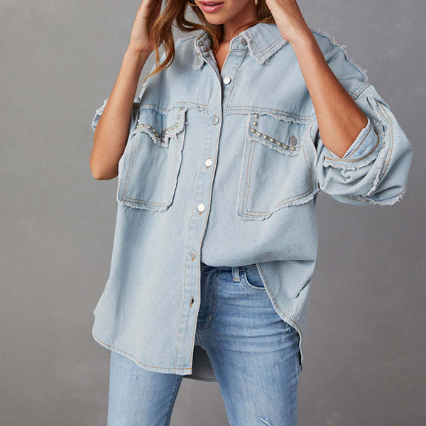 Den här jeansskjortan har en gammaltvättad design med strassdetaljer och en stativkrage för en trendig och fashionabel look. Perfekt för dagligt bruk!