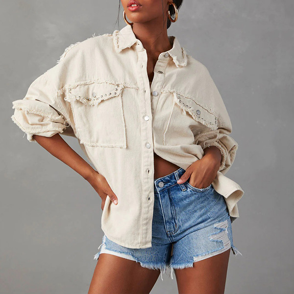 Mode gammaltvättad jeansskjorta med knäppning och strassdekorerad ståkrage