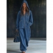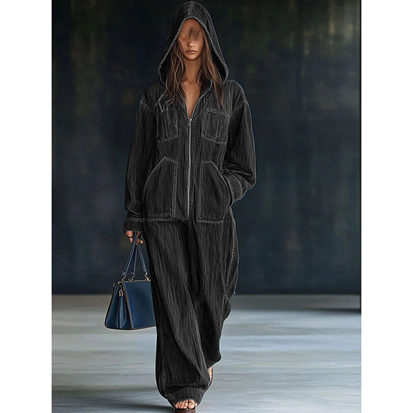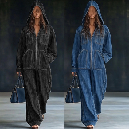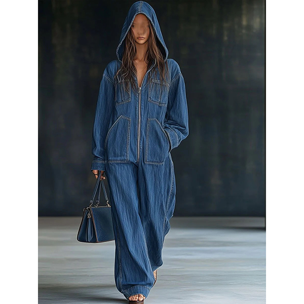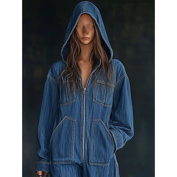 Långärmad denimjumpsuit med huva, dragkedja framtill och trendiga lappfickor