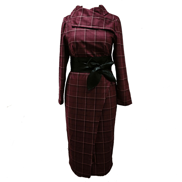 Rutig klänning med hög hals, långa ärmar, sidoslits och knyt i midjan