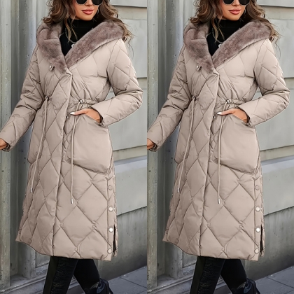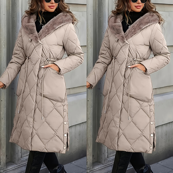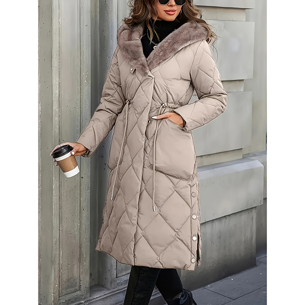 Quiltad plyschkappa – fodrad långärmad vinterjacka med dragsko i midjan och sidoknappar