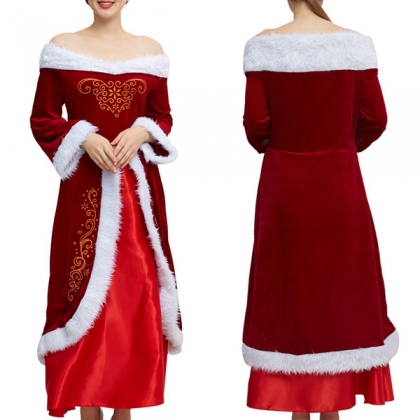 Fashion Plush Spliced Off-the-shoulder Long Sleeve Christmas Dress for Party