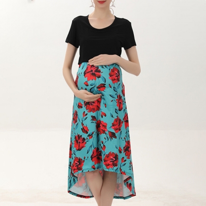 Modetryckt skarvad kortärmad amningsklänning med rund hals