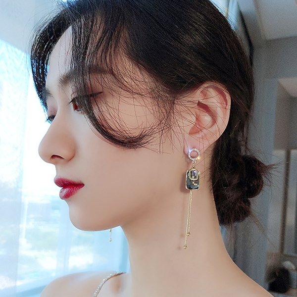 Fullända en charmig och vacker look genom att lägga till detta par örhängen. De har en tofs och ett rektangulärt hänge med strassdetaljer, och detta par kan inte bara pryda dina öron utan även förstärka din charm. Lägg till dem i din accessoarlåda!