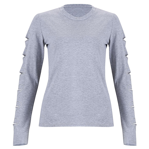 Compared with your other t-shirts,this one can better display your style and personality! The heart beaded and ripped details at the sleeve part make this piece look so distinctive,while its soft and breathable fabric will ensure you a comfortable day. Like it? Then buy one!
