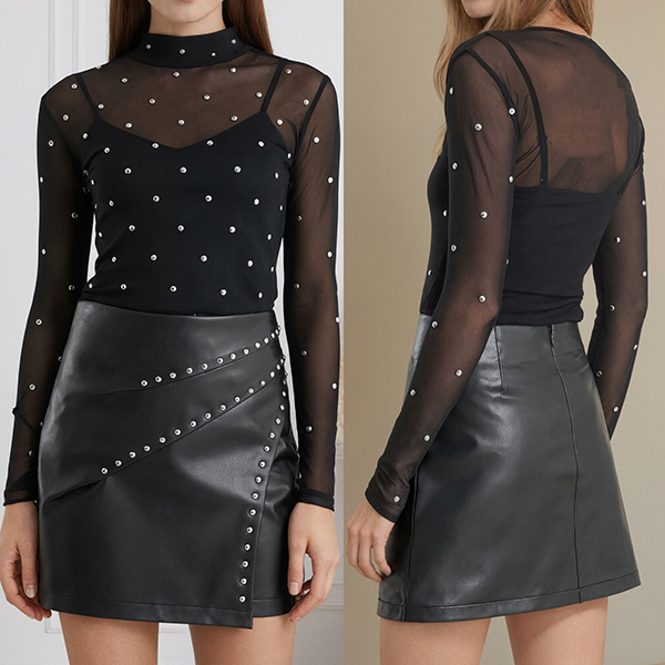 Denna tuffa kjol har distinkta nitdetaljer, smickrande hög midja och en modern sidslits som ger strukturerad sofistikering. Kombinera med åtsittande toppar och ankelboots för en modern, tuff look.
