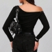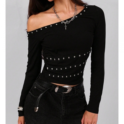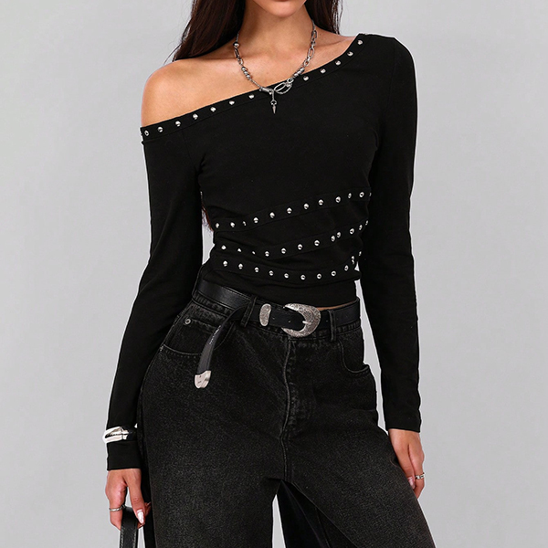 Denna tuffa skjorta har distinkta nitdetaljer, en modern snedställd axeldesign och en långärmad konstruktion för ett modernt och sofistikerat uppror. Kombinera den med åtsittande byxor och ankelboots för en modern och tuff look.