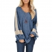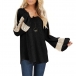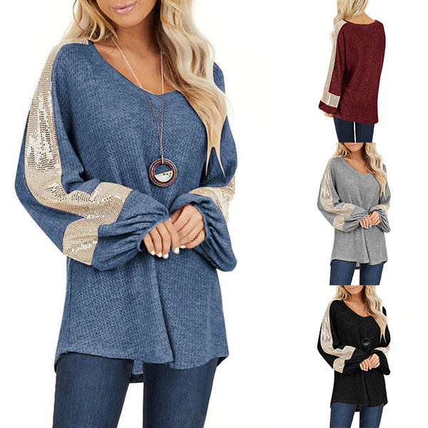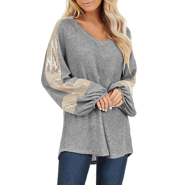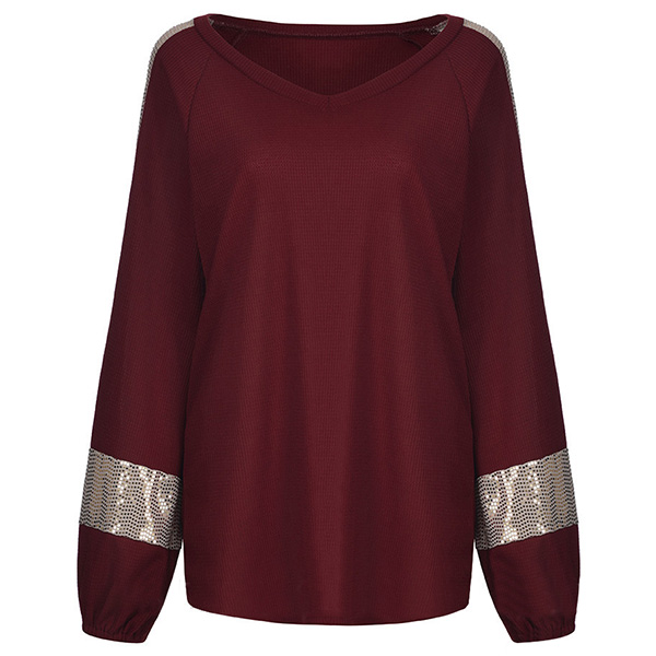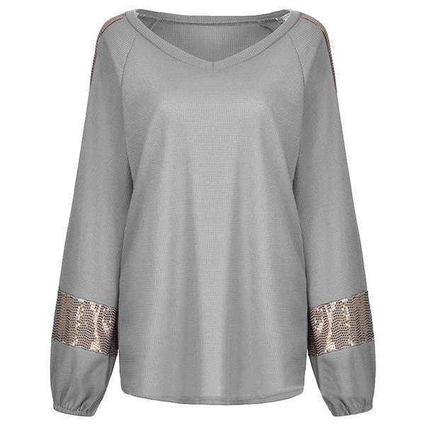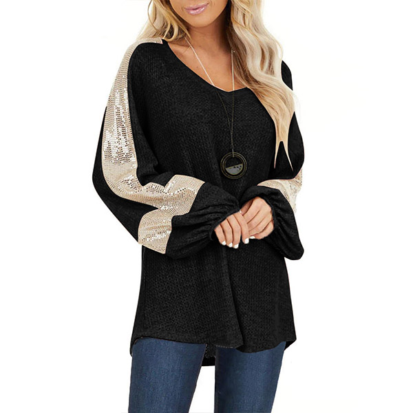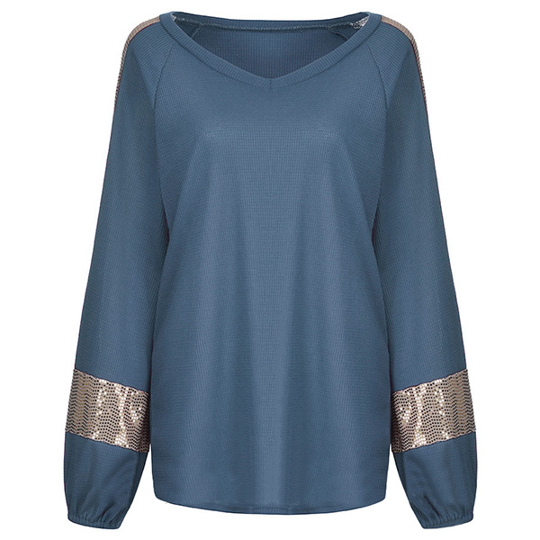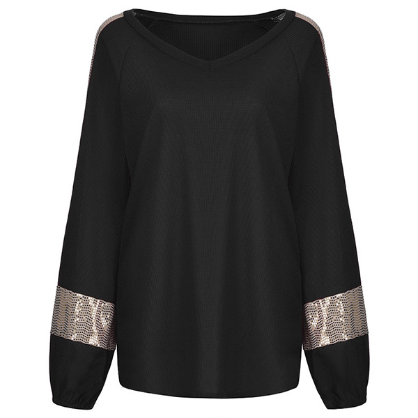Fashion Sequin Spliced Lantern Sleeve V-neck Loose Top