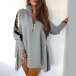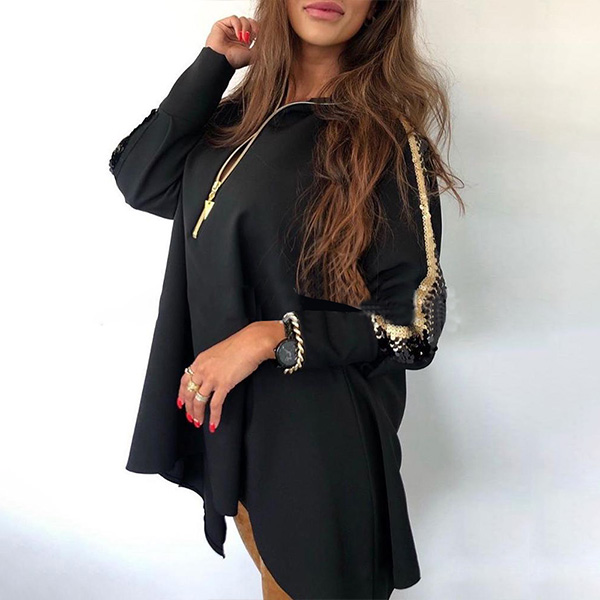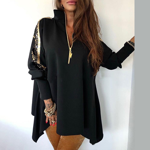 Fashion Sequin Spliced Long Sleeve Stand Collar Irregular Hem Loose Top