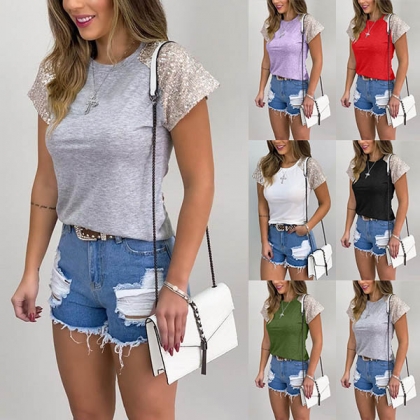 Fashion Sequin Spliced Short Sleeve Round Neck T-shirt