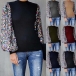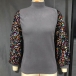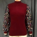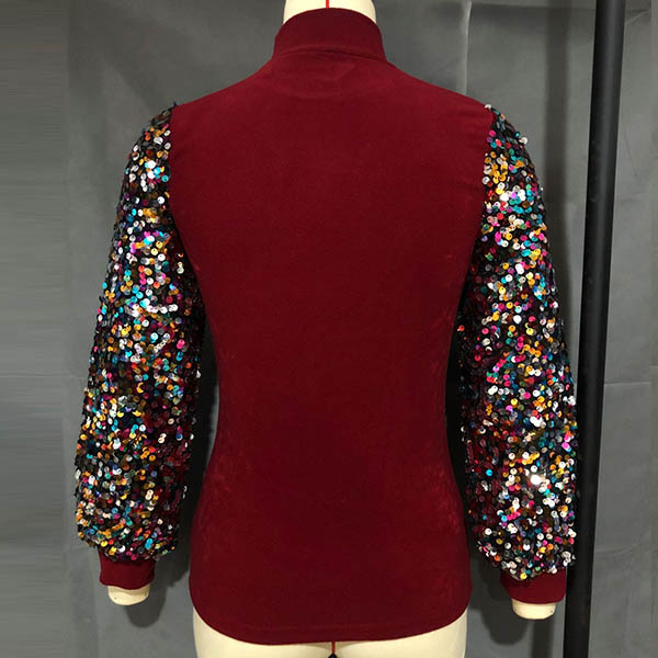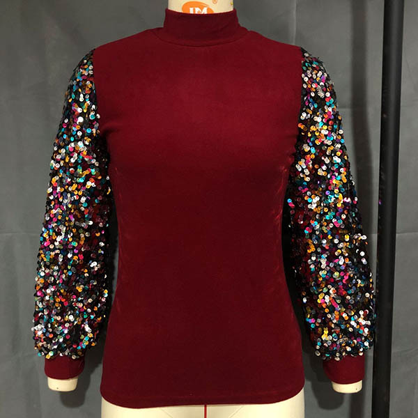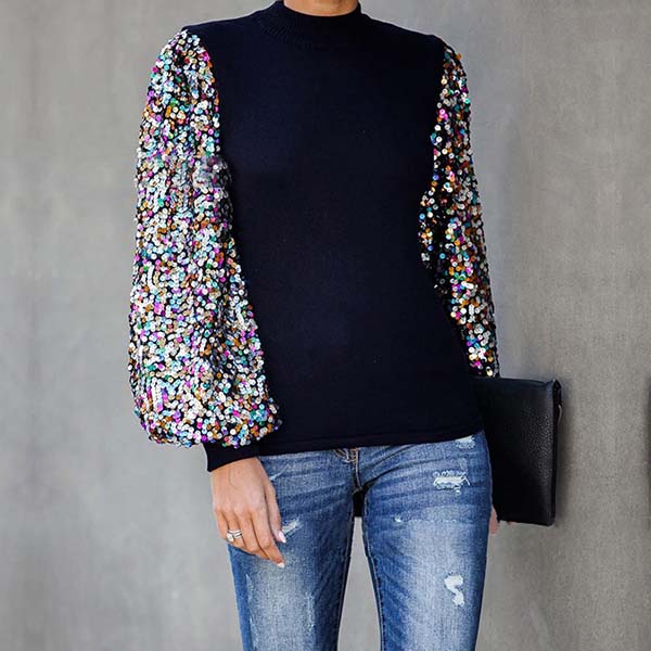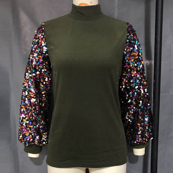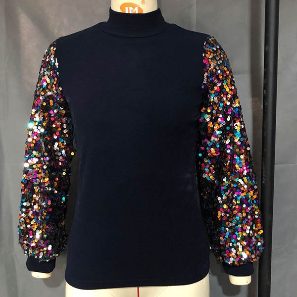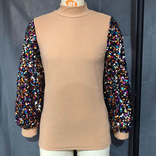 Fashion Sequin Spliced Trumpet Sleeve Mock Neck Top