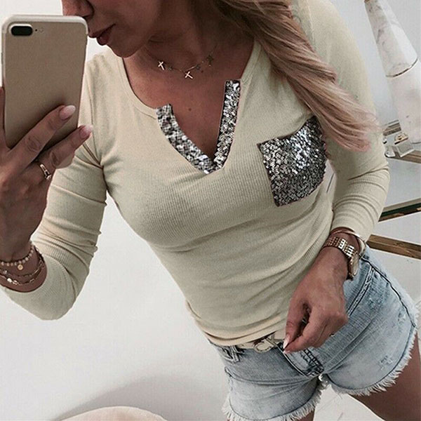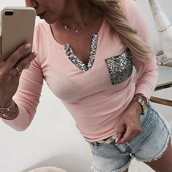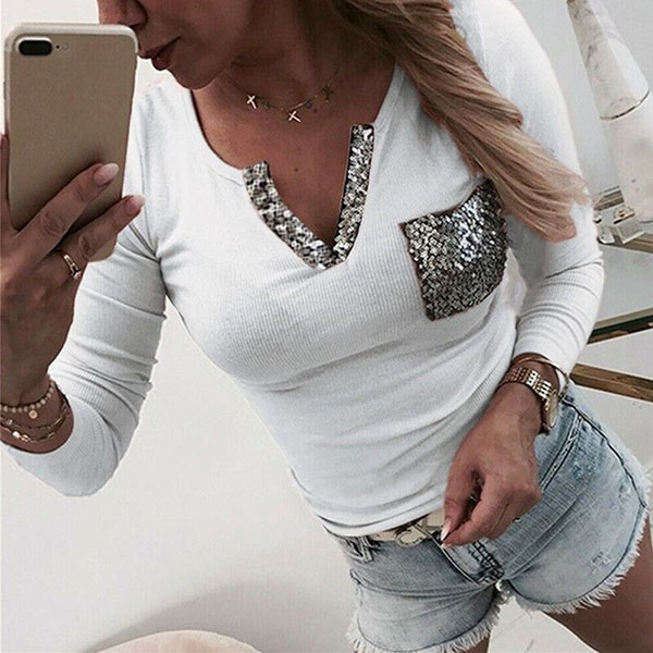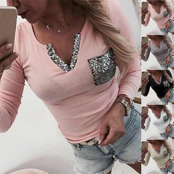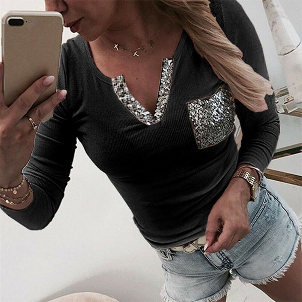 Tillverkad av mjukt och andningsbart tyg, den här t-shirten kommer garanterat att erbjuda dig en bekväm dag. Å andra sidan kommer designen med paljettskarvad v-ringning och bröstficka att förstärka dess charm ytterligare. All-match design gör att den kan matchas med olika stilar underdelar.