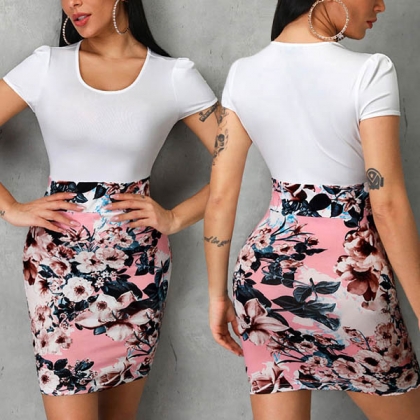 Fashion Short Sleeve Round Neck Printed Spliced Slim Fit Dress