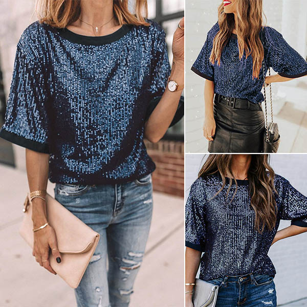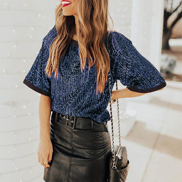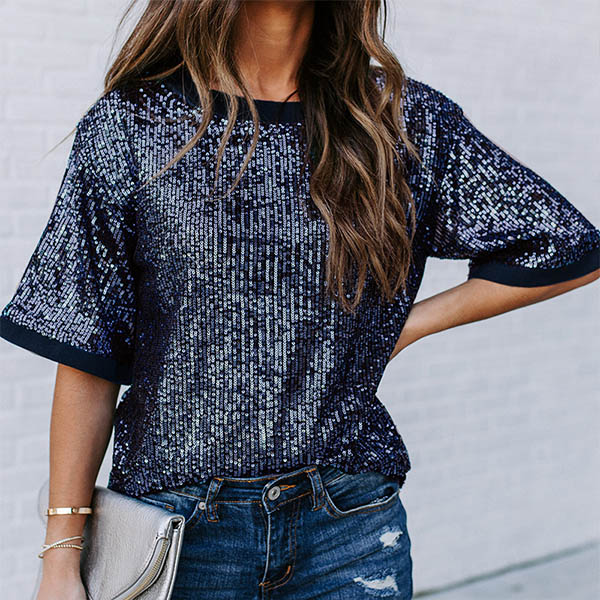 Fashion Short Sleeve Round Neck Sequin T-shirt