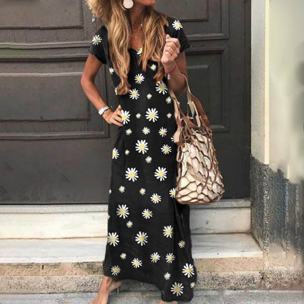 This dress is designed with daisy printed details,which can lend you a dash of fresh and sweet vibes. Finished with short sleeve,v-neck and crafted from soft and breathable fabric,this dress can offer you a comfortable day. So why not step out with this dress to enjoy your days?