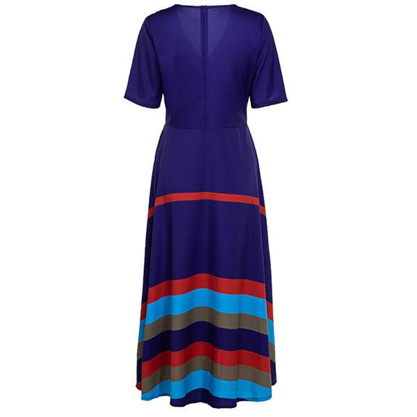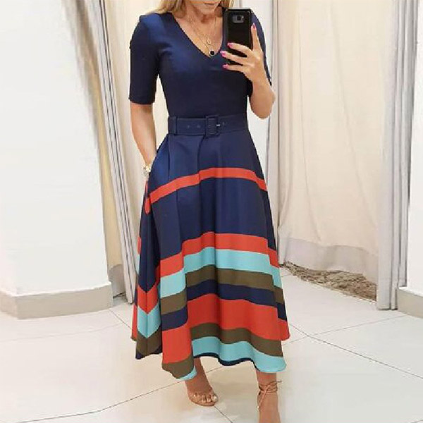 Fashion Short Sleeve V-neck High Waist Contrast Color Striped Dress
