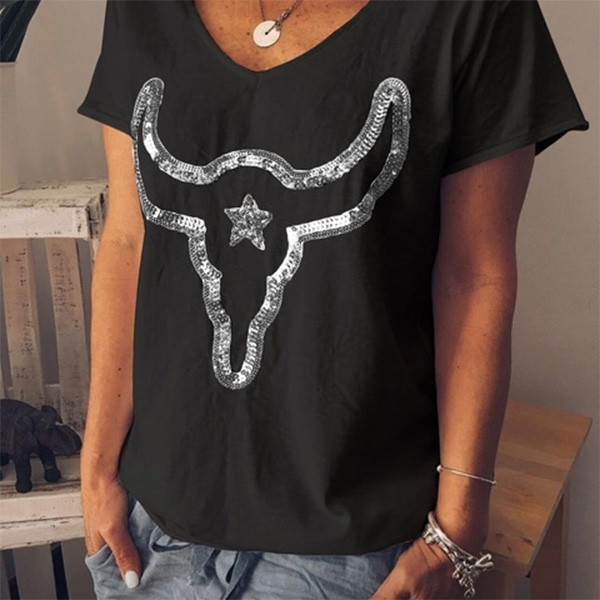 On these casual days,this simple,cozy yet stylish t-shirt can be your wise choice. It is finished with short sleeve and v-neck design,its soft,breathable fabric can give you a comfortable day,while the sequin spliced details will further enhance its charm. So why not invite one to your wardrobe ensemble?