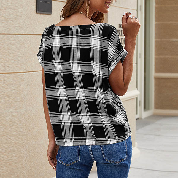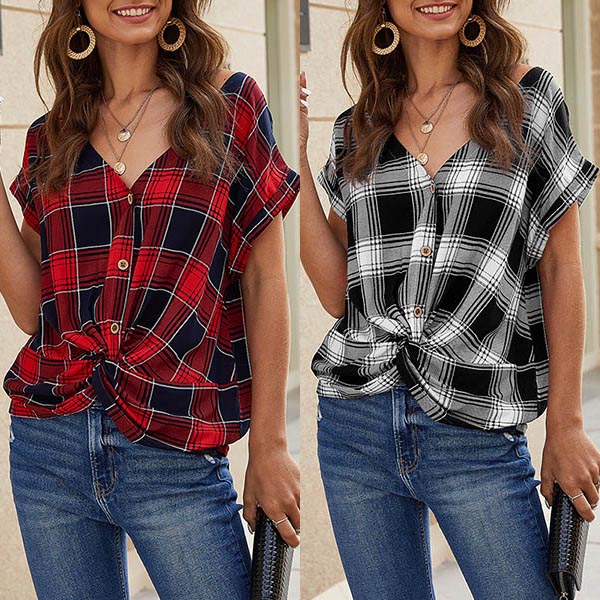 Only need one glance,you would be attracted by this chic and stylish top. The plaid element design makes this piece look so stylish and popular,while the v-neck and twisted hem design can easily enhance its charm. We suggest you matching with a skinny jeans to finish a fashionable daily look.