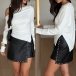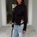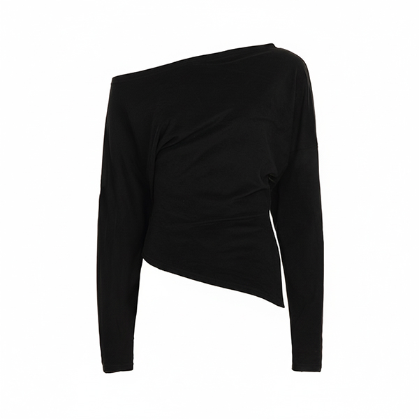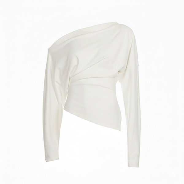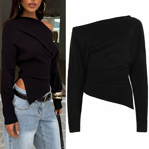 Denna arkitektoniska skjorta sticker ut med sin dramatiska snedställda axeldesign, strategiska sidoslitsar och modern, oregelbunden fåll som skapar en avantgardistisk och sofistikerad silhuett. Tillverkad i mjukt, följsamt material kombinerar den komfort med banbrytande stil – matcha med åtsittande byxor och ankelboots för en modern, elegant look som fångar blickarna.