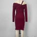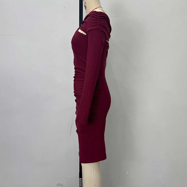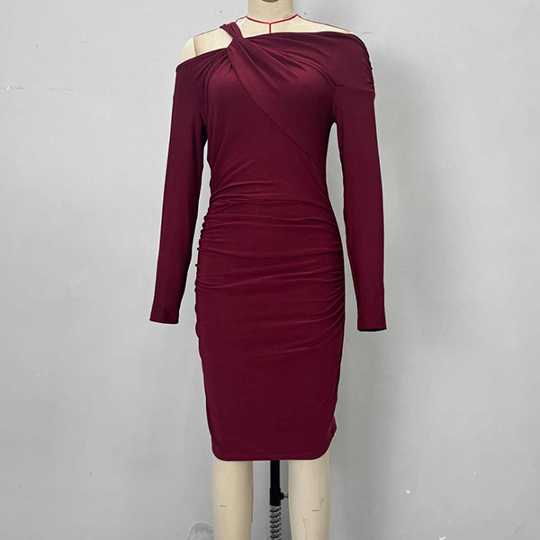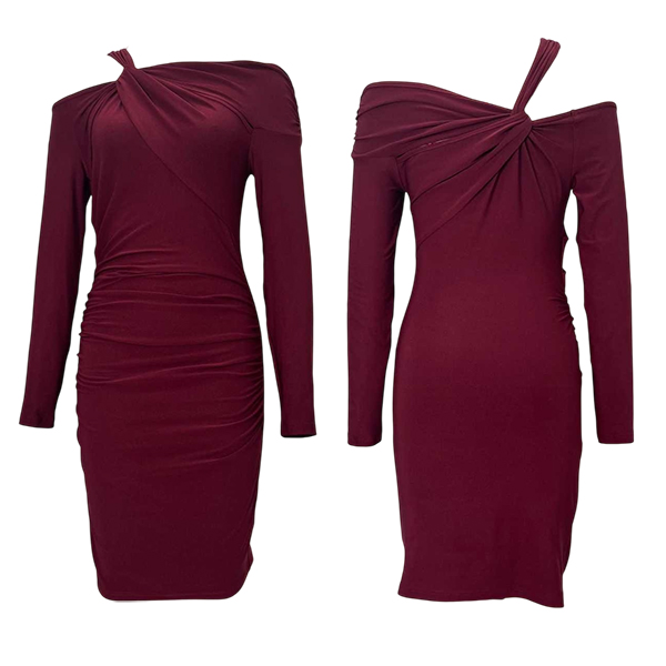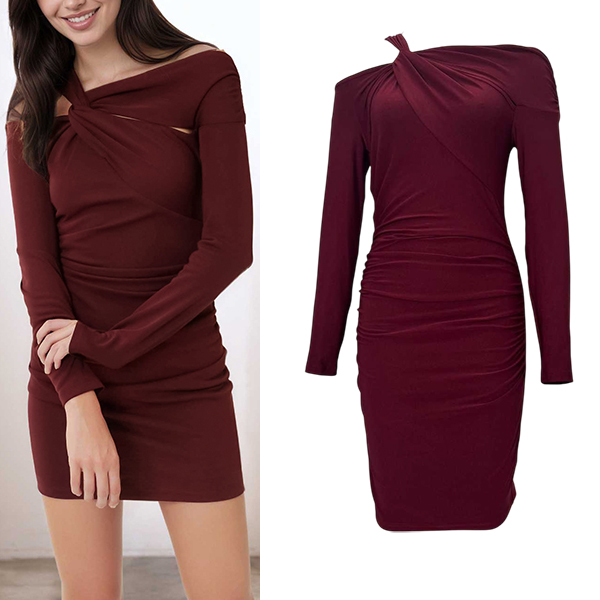 Bodyconklänning med asymmetrisk axel, rynkade detaljer och långa ärmar