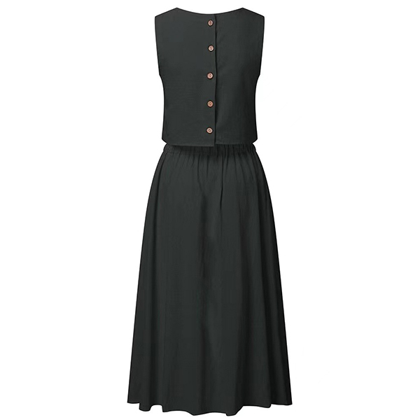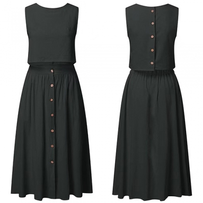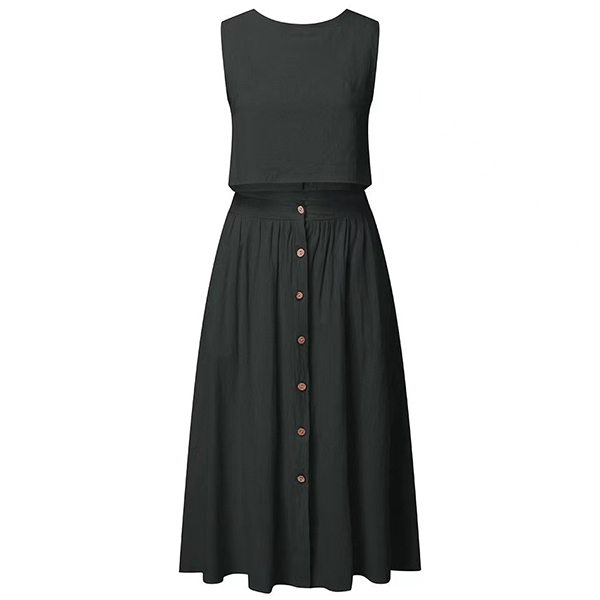 Solid color style,including a sleeveless round neck crop top and a high waist skirt,