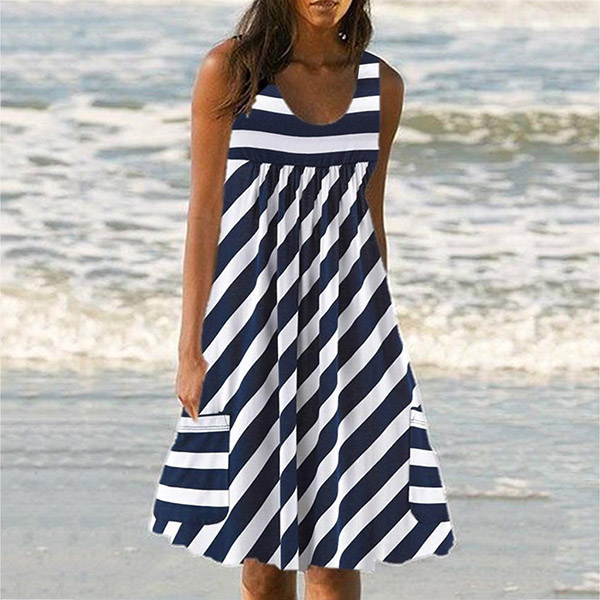 If you like stripe element,this this striped dress can easily arouse your attention. It is finished with sleeveless,round neck and front-pocket design,this dress can ensure you a comfortable day with its soft,breathable fabric and loose silhouette design. Perfect fit for these sun-soaked summer days.