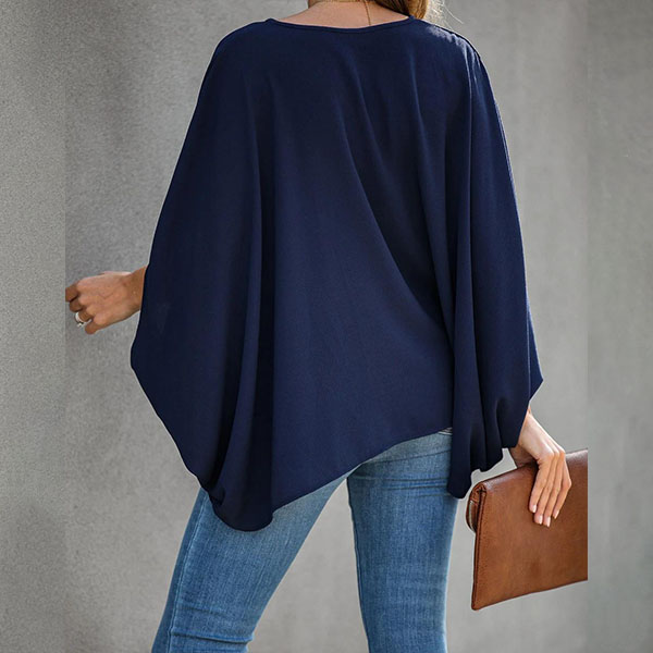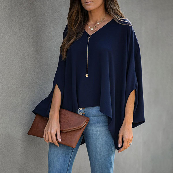 A unique style piece also can help you draw more eyes,this wonderful top is a good example. It comes with a solid color,its distinctive design details like 3/4 dolman sleeve,v-neck and irregular hem design make this piece look more attractive. When you wanna update your style,this piece can be a good choice.